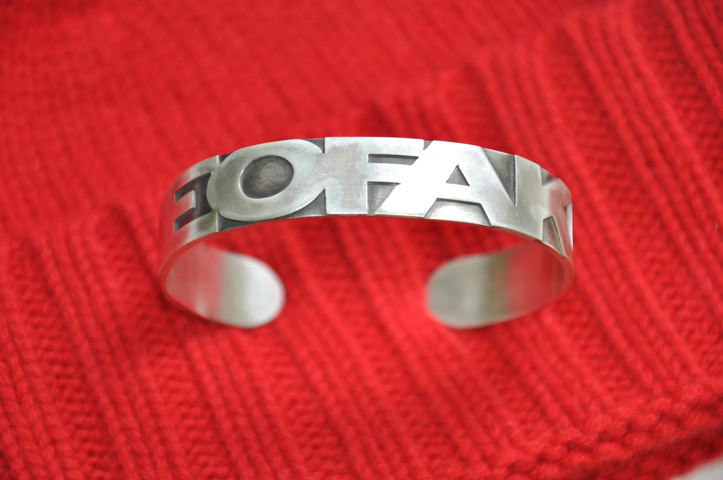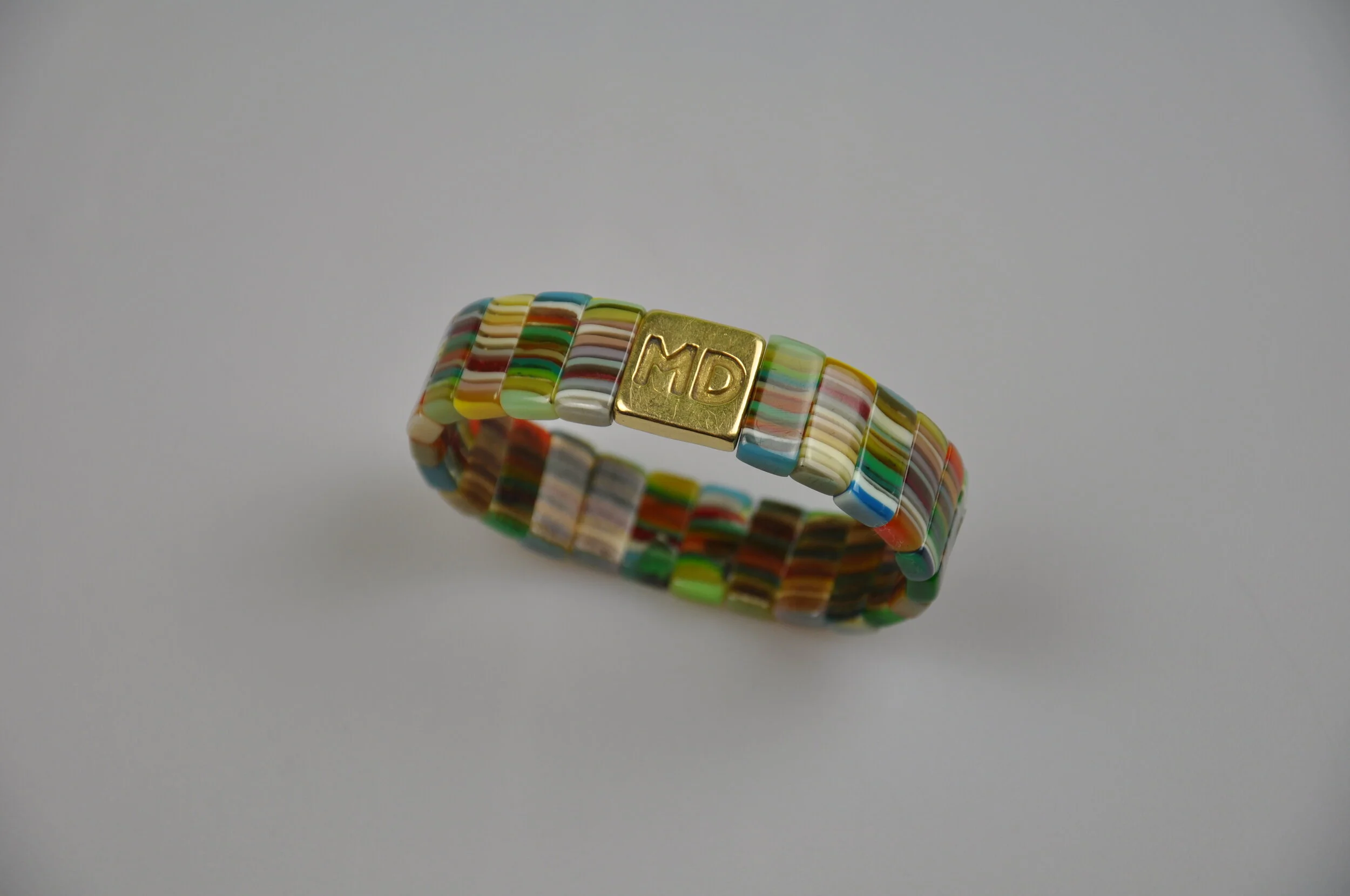 Die bunten Gute-Laune-Bändchen sind aus Kunstharz und mit einem massiven Silberelement bestückt, so kannst du sehr unkonventionell dein Familienwappen tragen, ein Monogramm gravieren lassen oder einfach so auf Patina warten.